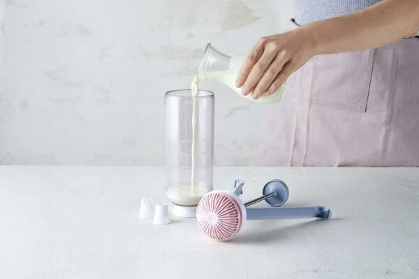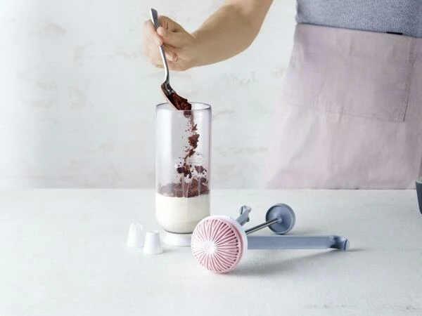 Zutaten nach Rezept(-flyer) einfüllen, Deckel drauf, 30 Sekunden vermischen und schon kann das Anrichten von Cremes und Desserts beginnen. Dafür sind einen Stern- und eine Lochtülle im Lieferumfang enthalten. Mit dem Dessert-Blitz von