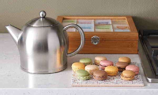 Modern, elegant und praktisch im Gebrauch. Was will man mehr von einer Teekanne? Die Teekanne Minuet Santhee in seiner modern-eleganten Form ist spülmaschinengeeignet und hat eine doppelwandig isolierende Konstruktion aus hochwertigem Edelstahl. Der Tee bleibt dadurch besonders lange heiß und geschmackvoll. Die Spezialform der Tülle und der ergonomische Beschlag ermöglichen ein hervorragendes Einschenken. Die Beschläge werden allenfalls handwarm. Zudem bürgen die verwendeten hochwertigen Materialien für eine lange Lebensdauer.