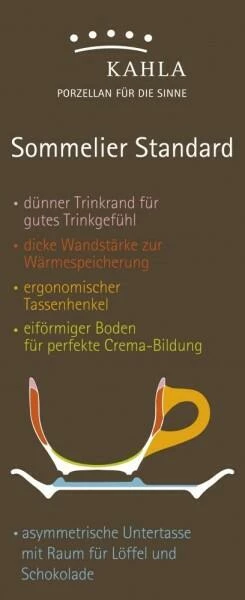 Bei der Entwicklung der Kollektion Café Sommelier wurde auf Details wie Größe, Wandstärke, Rand- und Innenform der Tassen geachtet, um einen optimalen Geschmack zu ermöglichen. So sorgt der dünne Mundrand für ein gutes Trinkgefühl. Die kräftige Wandstärke speichert die Wärme und hält den Espresso lange heiß. Die gerundete Innenform („Eiform“) der Tasse sorgt bei Kaffee aus der Espressomaschine für die perfekte Crema und ist angenehm beim Umrühren. Die Henkel sind so geformt, dass die Tassen bequem gegriffen und während des Trinkens mühelos in jeder Position gehalten werden können. Dazu kommen eine klassisch-elegante, harmonische Erscheinungsform, stabiler Halt auf der Untertasse und eine asymmetrische Untertasse, die viel Platz für Löffel und Schokolade bietet.