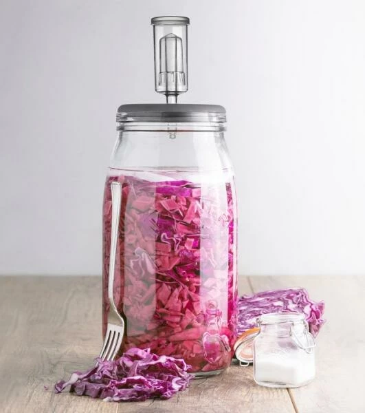 Dieses Fermentations-Set von Kilner bietet Ihnen die Möglichkeit auf einfachem Weg köstliche fermentierte Lebensmitteln zuzubereiten. Geben Sie einfach Ihre Lieblings-Gemüsesorten in das Glas und füllen es mit Wasser und ein wenig Salz auf. Mit der mitgelieferten Luft-Pipette entziehen Sie die Luft aus dem Glas, sodass sich das zur Herstellung von fermentierten Lebensmittel typische Milieu entwickelt. Perfekt zur Schaffung von Live-Kulturen von Sauerkraut, Kimchi, Gurken und vieles mehr.