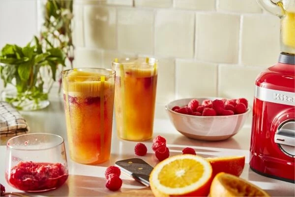 Standmixer K150 in empire rot. Hochwertiger Standmixer mit 3-teiligem Mix-System, bestehend aus einem 0,9 PS starkem Motor, einer einzigartig asymmetrischen Klinge und einem Behälter mit Skala.