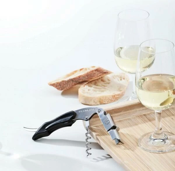 Das völlig neue Kellnermesser arbeitet mit patentiertem 2-Step-System. Step one: Aufklappen, Spirale eindrehen, oberen Teil aufsetzen, eindrücken und den Korken zur Hälfte heraushebeln. Step two: den Griff absenken, unteren Teil aufsetzen und den Korken komplett ziehen. Mit der Push-Funktion wird außerdem ein Abrutschen vom Flaschenrand verhindert. Ein unentbehrliches Utensil sowohl für Zuhause als auch für die spontane Verkostung unterwegs.