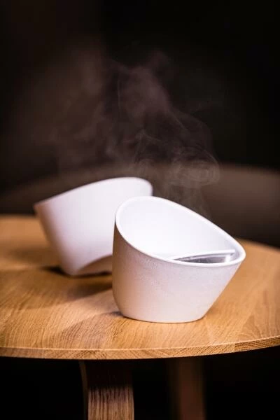 Teetasse LASTU in weiß. Die designprämierte Teetasse mit schrägem Boden und inklusive Teesieb bietet einzigartigen Teegenuss! Und die Tasse ist aus einem Holz-Verbundstoff und hat dadurch eine einzigartige Oberfläche, die nicht zu heiß ist. Kunststoff-frei!