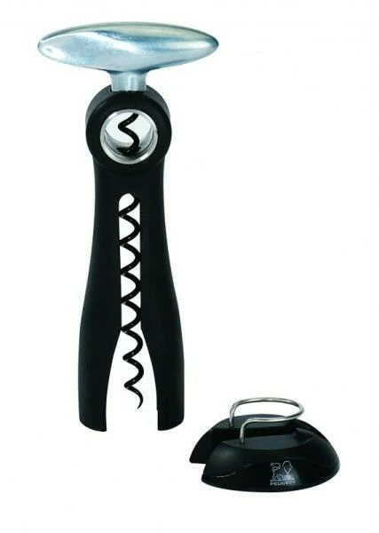 Mit diesem äußerst stabilen Korkenzieher lassen sich Weinflaschen ohne großen Kraftaufwand spielend öffnen. Der Kapselschneider dienst gleichzeitig als Ständer für den Korkenzieher.