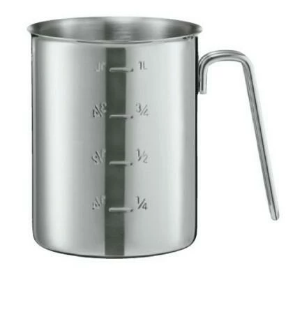 Edelstahl 18/10 mit Drahtgriff, außen hochglanzpoliert, innen matt, Einteilung von außen und innen ablesbar, mit Schüttrand.